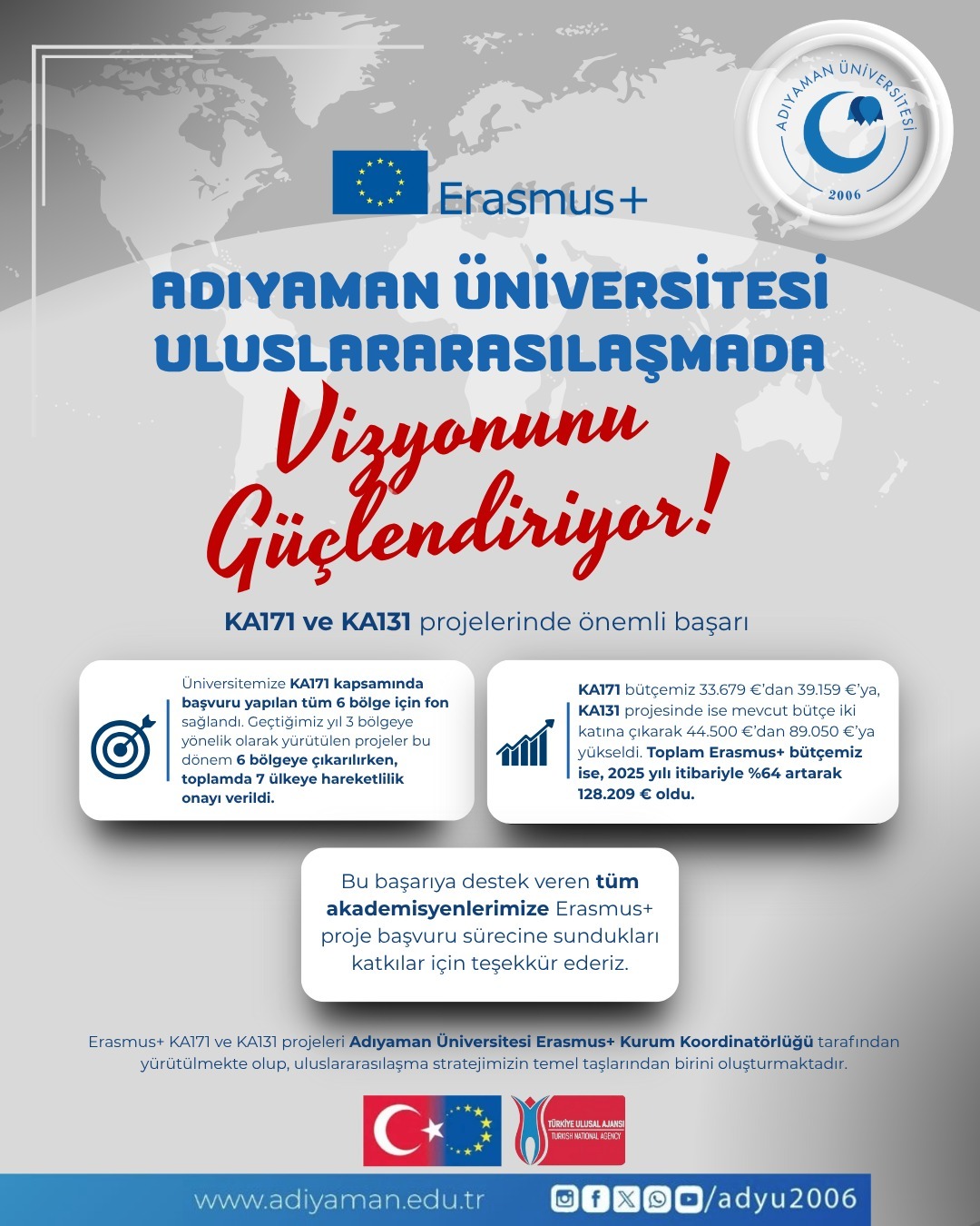 Erasmus+ KA171 ve KA131 projeleri Adıyaman Üniversitesi Erasmus+ Kurum Koordinatörlüğü tarafından yürütülmekte olup, uluslararasılaşma stratejimizin temel taşlarından birini oluşturmaktadır.